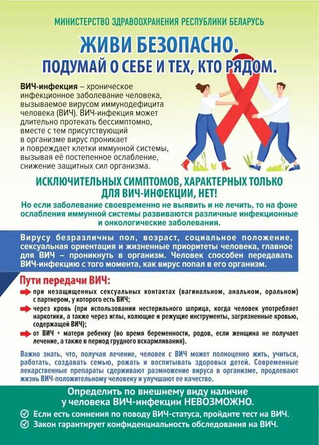 Большинство людей, живущих с ВИЧ, имеют полный доступ к необходимой помощи и наблюдаются в консультативно-диспансерных отделениях или кабинетах по ВИЧ в организациях здравоохранения по месту жительства. Каждый человек с положительным ВИЧ-статусом имеет право на бесплатную антиретровирусную терапию с момента постановки диагноза. Все регионы Беларуси движутся к стратегической цели Объединенной программы ООН по ВИЧ/СПИДу (ЮНЭЙДС) 95-95-95. Данная стратегия подразумевает, что к 2026 году 95 % людей, живущих с ВИЧ, будут знать свой ВИЧ-статус; 95 % людей, знающих свой ВИЧ-статус, будут получать лечение; у 95 % людей, получающих лечение при ВИЧ, в лабораторных условиях не будет определяться вирусная нагрузка.